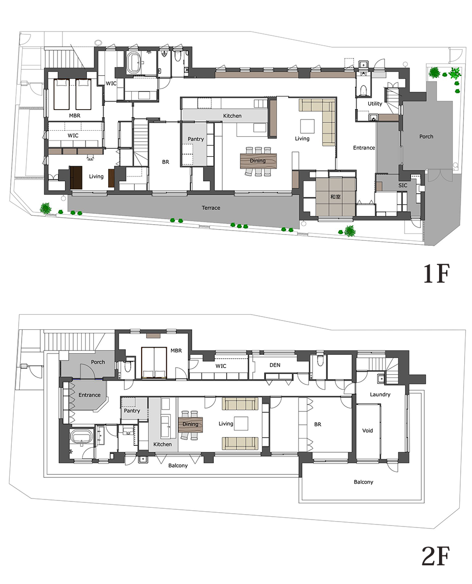 敷地を2つに分けて自宅と賃貸アパートの2棟のRC造新築工事を行なった。 自宅は地下1階地上2階建ての2世帯住宅で、将来の間仕切変更を考慮してラーメン構造とした。 賃貸アパートは地上2階建ての2LDK x8世帯で、壁式構造を採用した。 別棟ではあるが、一体感の出るよう近似仕様の外壁や同仕様の塀でまとめることにした。 自宅親世帯のアプローチから続く玄関土間は天然石貼りとし、玄関ドアにはオートロックに加えタッチキー付きの無垢の木製引き戸を採用した。 玄関正面壁にも天然石を貼り上質な空間を目指した。 玄関内部は吹き抜けのトップライトから光が差し込み日中はいつも明るい空間となっている。 30畳強のLDKには、必要な箇所に造作収納を設け、エアコン隠しも兼ねている。 LDから続くテラスに設けた塀は、プライバシーが保たれる高さを確保しつつ光と風は取り込めるよう配慮した。 キッチンはオーダーで、希少なトリュフビーチの扉やシーザーストーンを使用し、美しくかつ使いやすいよう設計されている。 リビングに隣接する和室(仏間)は、玄関ホールからもアクセス可能で、シンプルなつくりながら、麻すさ入りの珪藻土やチョウナ仕上げの床板など細部への拘りも感じられる空間となっている。 ユーティリティーから続く2階には、大量の洗濯物を一気に干すことができるランドリースペースを確保した。 地下室にはドライエリアを設け、明るく風の入るスペースとなっている。 子世帯は、ガラッと趣が変わり白ベースのモダンな空間となっている。 親世帯と同様に多くの収納スペースがあり、子供部屋には動かすことのできる間仕切収納も設置。 ウォーリーの壁紙を貼った個室や、オレンジ色の玄関ドアなど施主の趣味が詰まった個性的な家となった。 |