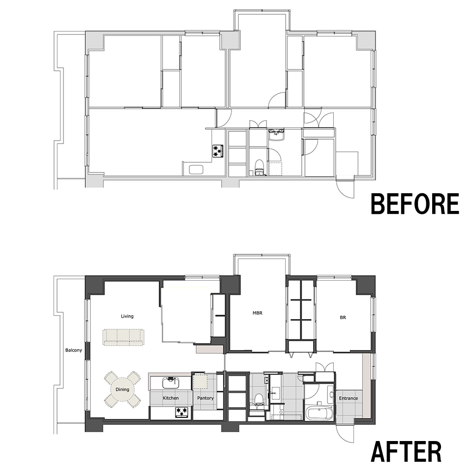 せっかくの角部屋なのに外壁面に断熱材が入っておらず寒い事、床に段差が多くある事、部屋も小さく区切られ使いにくい事、等の不満を解消するべくスケルトンリフォームを検討されていた施主様。 弊社で以前工事させて頂いた同じフロアの住人宅をご覧になり、間取りや内装を気に入ってくださってご依頼いただくことになりました。 まずは寒さ対策として外壁に断熱材を入れ床暖房も設置しました。 床段差の解消も行い、角部屋を活かした使いやすい間取りにリフォームしました。 窓もあり明るい玄関には、あると便利なコートハンガーやミラーや手摺もさりげなく設置。 下足入れは高さを抑えて圧迫感のない仕様とし、その分長さをとって収納量を確保しました。 洗面室は、既製品の化粧台に少し手を加えて造作の趣に仕上げ、ランドリーパイプやちょっとした隙間にも収納を作り使いやすくしました。 マンションではよくある排水管が露出しているタイプの便器はキャビネット付きの便器に変更し、お掃除も楽で見た目もスッキリしました。 人気の二の字配置のキッチンには大容量で通り抜けもできるパントリーを隣接させました。 広く取ったリビングには、L型の扉を閉めればゲストルームとしても使えるスペースも確保。 無垢単板フローリングや好みの色で塗装した壁や天井で柔らかい雰囲気の内装に仕上げました。 キッチンからの眺望も良くなり、各部屋の引き戸を開けると風の通り抜ける気持ちの良い空間になりました。 関連リンク(別サイト) リノベりす ”断熱と床暖房で冬の寒さを解消。オープンな間取りが心地よいスケルトンリノベーション” |