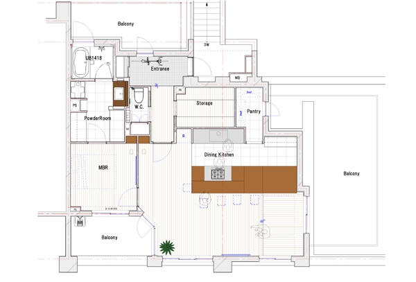 料理を仕事とする施主夫婦の家とあって最初にオーダーされたイメージが「要塞のような大きなキッチン」だった。 眺望の良い南側をみながら調理ができるキッチンはダイニングテーブルと一体となり小上がりの一部はベンチとしてテーブルを囲む。どこにいてもキッチンが生活の中心となるような計画とした。 非常に大きな天板の一部を取り外し可能にし、使用状況に応じてペニンシュラとアイランドを使い分ける事が出来るデザインとしている。一部はダイニングテーブルとしてだけでなくレシピなどを調べたり家事を行うデスクとしての機能も兼ね備えている。 また、寝室と玄関ホールは引渡時に施主とその友人一同でそろいのツナギを用意し、イベントとして楽しみながら最後の仕上げをおこなった。 雑誌掲載 リライフプラス vol.28 関連リンク(別サイト) リノベりす ”大容量のパントリーのおかげでキッチンがいつもスッキリ!【マンションリノベ新・3種の神器】” |