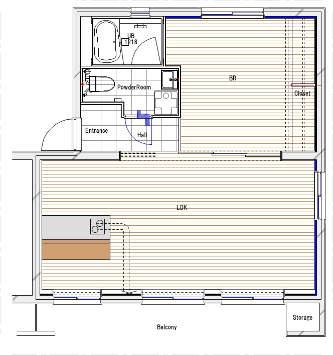 50代のご夫婦の為のリノベーションを計画した。 築も古く開口部などの高さも当時の平均身長に合わせているため現在の建物と比べて低く、1mmも無駄にできない案件であった。玄関とホールには段差を設けず境をあいまいにし床の高さを上げないことで有効な高さを確保することでバリアフリー化にもつながった。 キッチンは当初リビングへの対面式を希望されていたが夫婦二人で暮らす家というコンセプトからあえてコンパクトにキッチンとダイニングスペースをまとめ、リビングエリアを大きくとる計画を提案した。 寝室の収納にはあえて建具を設けずロールカーテンで代用することで引き代のない全開放できるようにすることと収納内に湿気が籠らないように計画している。 また、あえてリビングは3枚の引き戸で常に玄関ホールか寝室のどちらかとつながるようにしてある。コストだけではなく空間として広く感じさせることを目的としている。 |