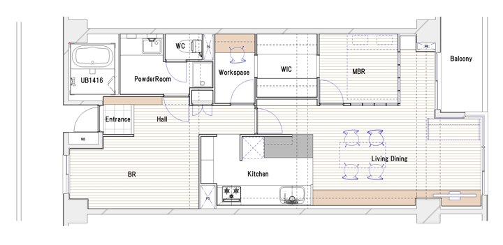 室内窓からみる景色 打合せ当初より室内窓を設けたいとの要望から寝室とダイニングを分ける仕切りに設けることとした。 木製で造作することも検討したが見附が太くなり圧迫感を与える為、スチールで造作しシャープな印象をもたせた。 サンルームとリビングを隔てる梁の存在感を軽減する為、あえてサンルームの天井高を低くし板張りとした。低めのソファに座って過ごすことを想定している為、低さがちょうどよい籠り感を醸し出している。ウッドブラインドもたたみ上げると下げた天井に収まり、視線の邪魔とならないように配慮している。 関連リンク(別サイト) リノベりす ”室内窓がつくるスタイリッシュな住まい。梁の存在を逆手に取ったマンションリノベーション” |