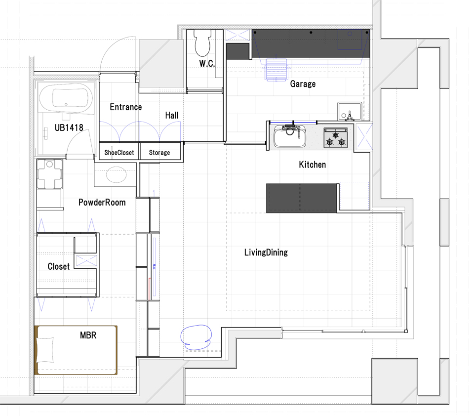 施主は蔵書が多く、趣味のプラモデルの為に塗装ブースを設けた作業部屋を望まれていた。 既存の3LDKを2LDKとし一部屋を趣味の部屋に、もう一部屋は寝室としクローゼットと水廻りをまとめた。 蔵書を収納するために設けた本棚によって、プライベートな空間を隔離しプライバシーを確保しやすいよう計画した。急な来客でも本棚を閉めることにより生活感を隠すことができる。 LDKと寝室はメンテナンス性と清掃性を考慮し床材は総てタイルで仕上げ、ロボット型掃除機が常に活躍している。 趣味の部屋には塗装用に塗装ブースを設け耐薬品性の高い天板で作業台を設けた。また、シンクを設けることで使用した機材などをそこで洗浄することができ、キッチンや洗面を汚さずに趣味部屋内で完結するように配慮をしている。 関連リンク(別サイト) リノベりす ”大切な本とプラモデル。スケルトンリノベで趣味を満喫する家を実現!” |